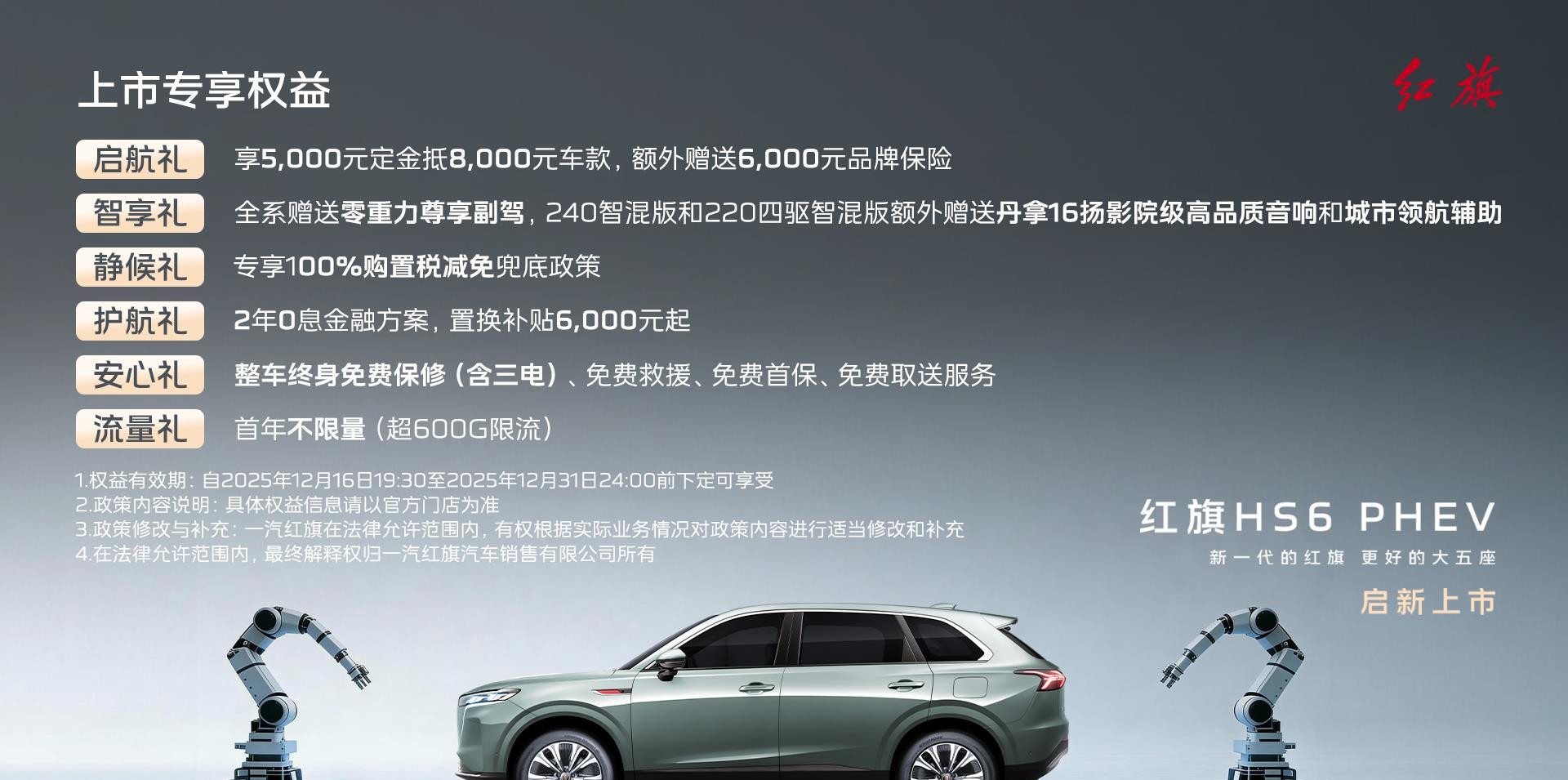 从一道道精密的工艺,到一项项严苛的测试,红旗HS6 PHEV以全新的产品理念、全维的技术突破和全程的品质把控,兑现了“新一代的红旗,更好的大五座”承诺。新车承袭国车对品质与安全的极致追求,以17.88万元起售的价格,将一汽红旗对家的理解与关怀,转化为切实可感的获得感,让红旗HS6 PHEV成为一汽红旗在新能源时代交给中国家庭的诚意之作。